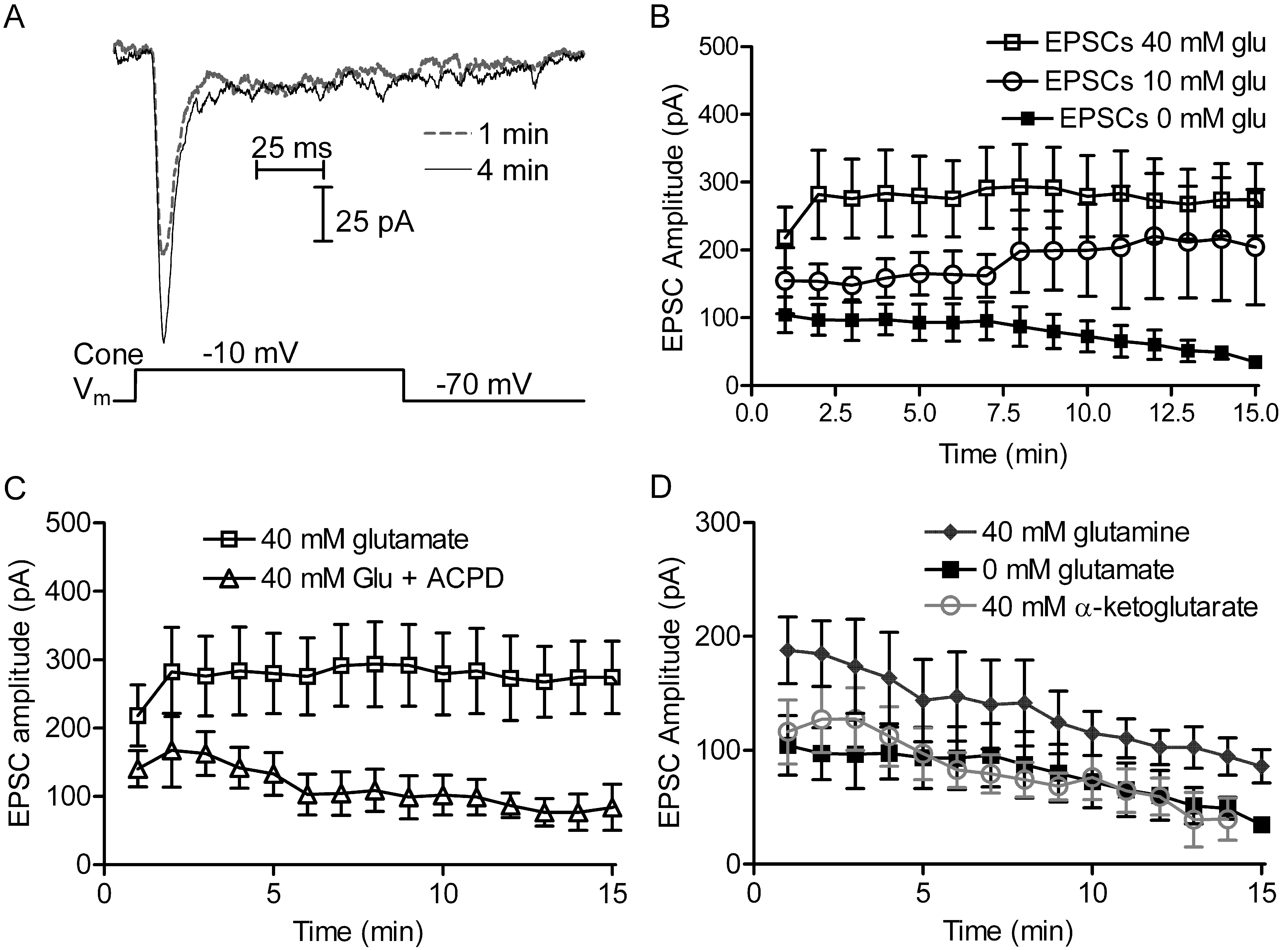 containing 40 mM glutamate. EPSCs were evoked by depolarizing the cone