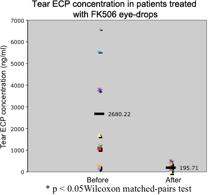 Comparison of tear ECP levels before and after treatment with 0.1% tacrolimus eye-drops. Note the significant decrease in the ECP values in patients treated with tacrolimus eye-drops for 1 month.
