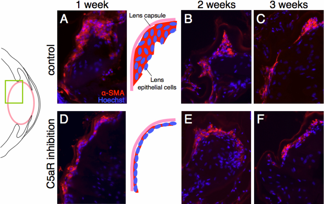 Figure 1. Effects of C5aR antagonist on EMT of lens epithelial cells cataract surgery in vivo. EMT was assessed by staining of sections