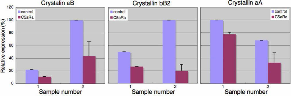 due to C5 antagonist treatment, as was the case in the microarray analysis. Statistics are as follows: CryaB-1: p=0.0000114343<0.05, CryaB-2: p=0.0000296783<0.05, CrybB2-1: p=0.0000598278<0.05, CrybB2-2: p=0.0002057<0.05, CryaA-1: p=0.005616049<0.05, CryaA-2: p=0.000385042<0.05.