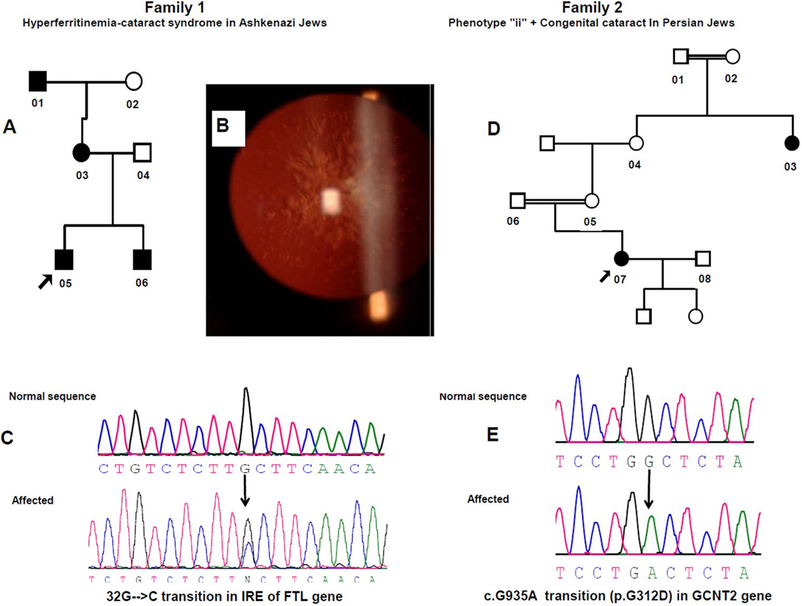 start site (c. −168G→C), is indicated by black arrow. D: Persian Jewish family pedigree affected by congenital cataract (no photograph available) and phenotype ii. E: DNA sequence analysis showing a homozygous G → A transition (indicated by black arrow) at cDNA position 935, resulting in