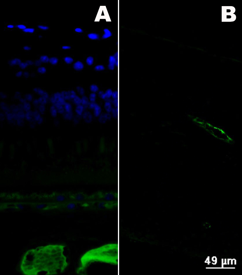 was used to show nuclei and positive staining of bevacizumab (green) was showed in blood vessels. A: Bevacizumab (green) was detected in choroid vessels four weeks after IVB. B: Bevacizumab (green) was detected in the walls of iris vessel four weeks after IVB.