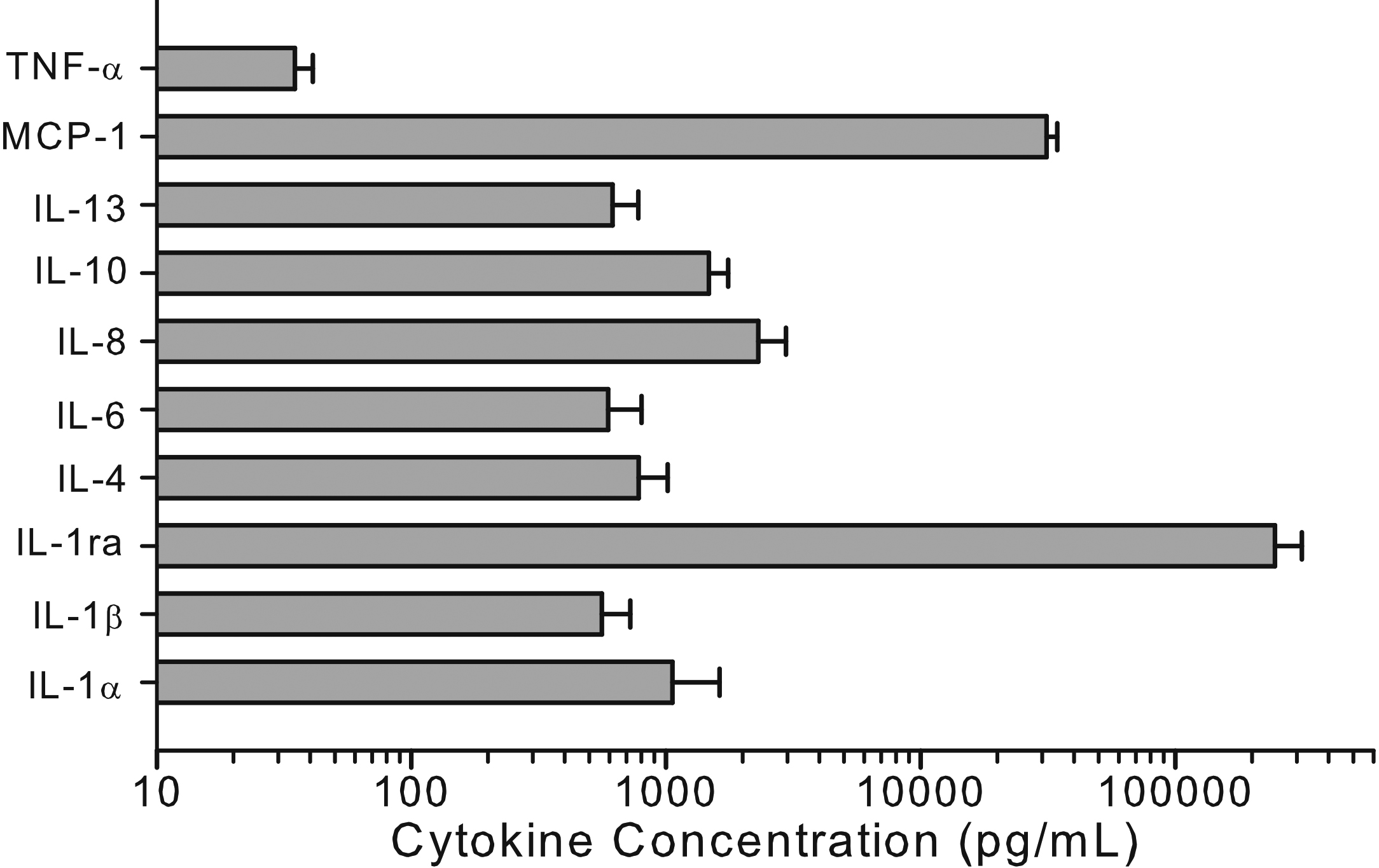 Concentrations of 10 cytokines extracted from clinical Schirmer strips. All data are expressed as mean±SEM.