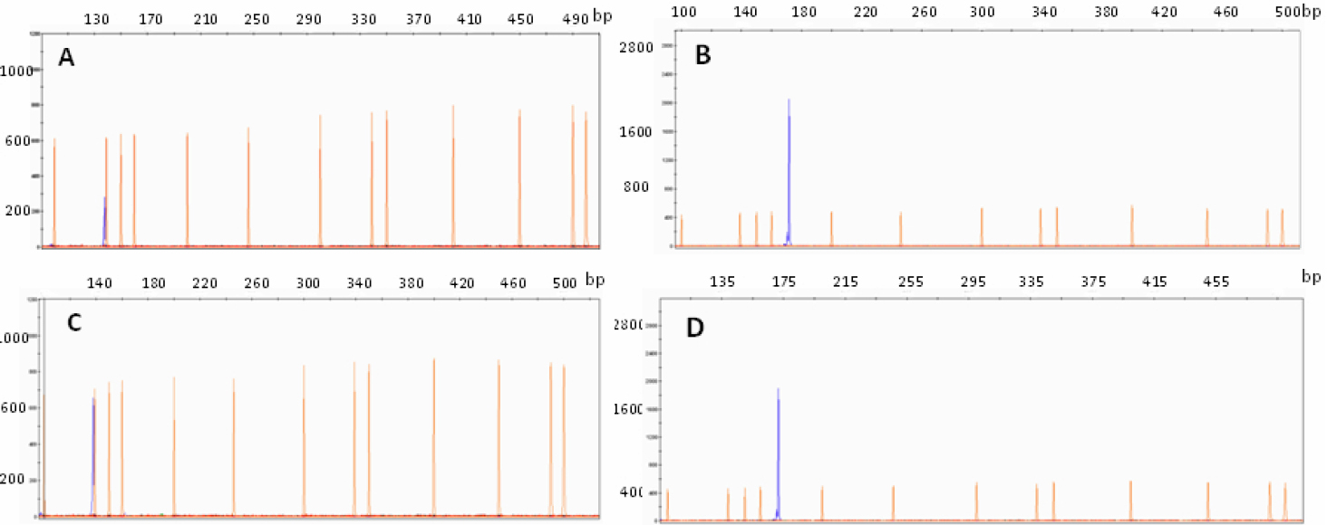 Capillary electrophoresis showing fluorescent PCR amplification of (A)