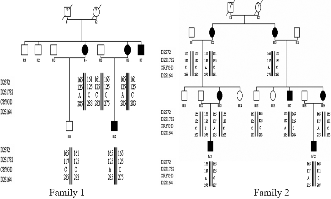 Pedigree and haplotype. Haplotype analysis of the families demonstrated segregation of three microsatellite markers flanking