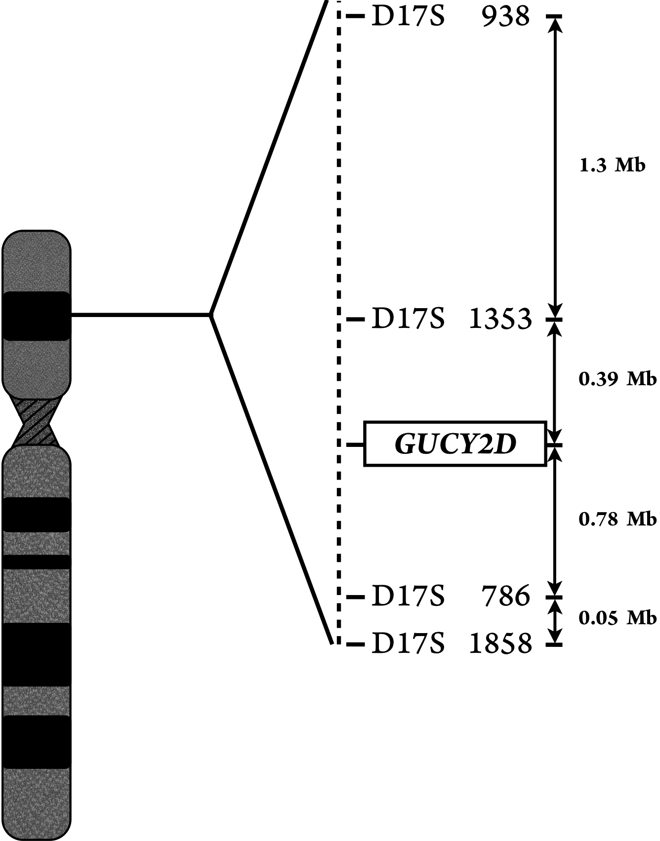Figure shows a map of the CORD6 region. Distance between markers and the locus CORD6 are indicated in bp.