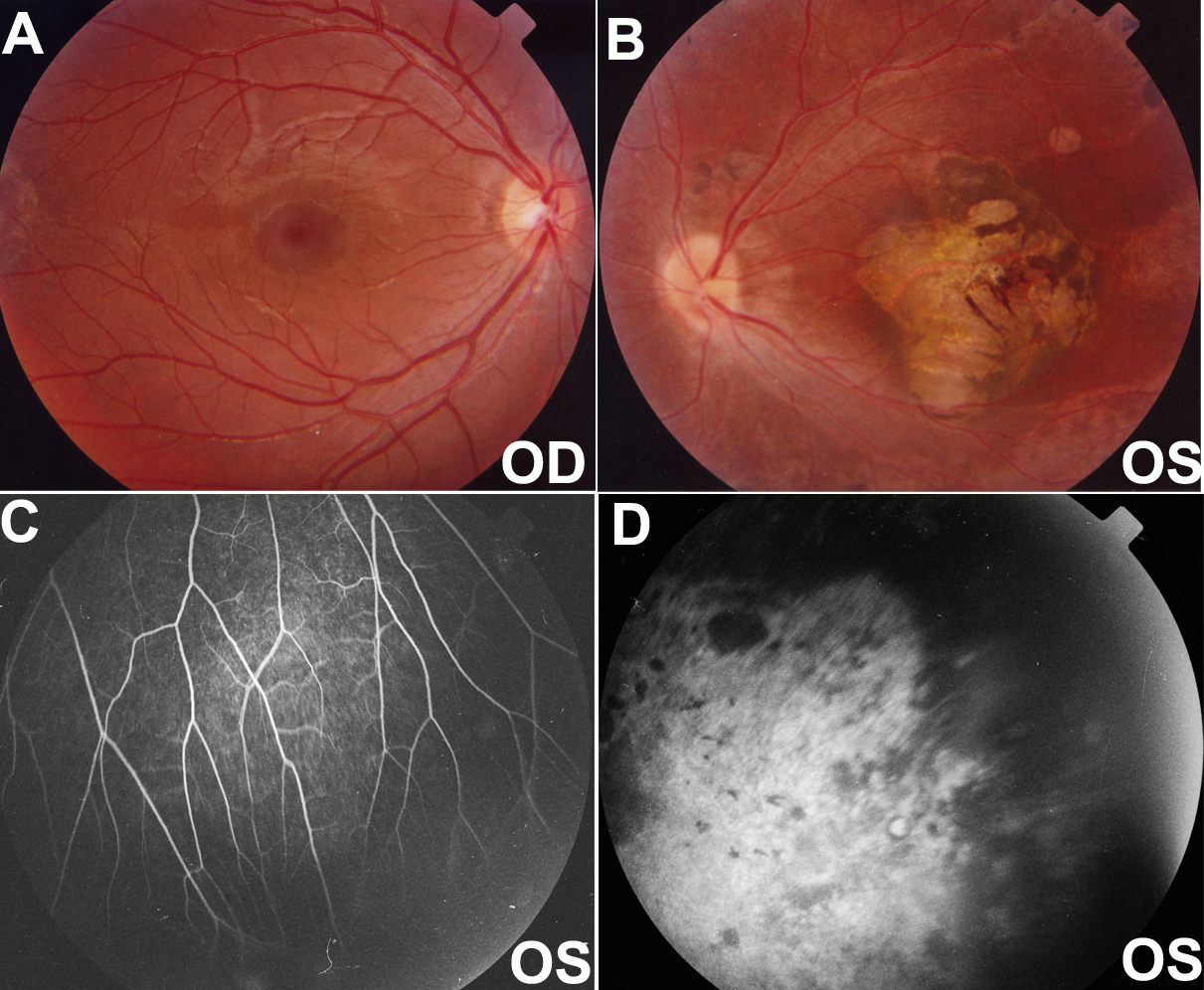 in the left fundus. C and D: Fluorescein angiography of the left eye shows straightening of the vessels with increasing branching (C) and a peripheral avascular zone (D). OD and OS represent the right and left eyes, respectively.