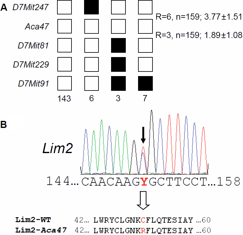 Figure 2. Fine mapping of the Aca47 mutation and its effect on the Lim2 gene. A: Haplotype analysis revealed a critical interval of 14.9 Mb between the markers D7Mit247 and D7Mit81 including the candidate gene Lim2. Black boxes illustrate the presence of two C3H marker alleles (recombination between microsatellite marker and Aca47); white boxes illustrate presence of one copy of both alleles, C3H and C57BL/6J (lack of recombination). The number of G3