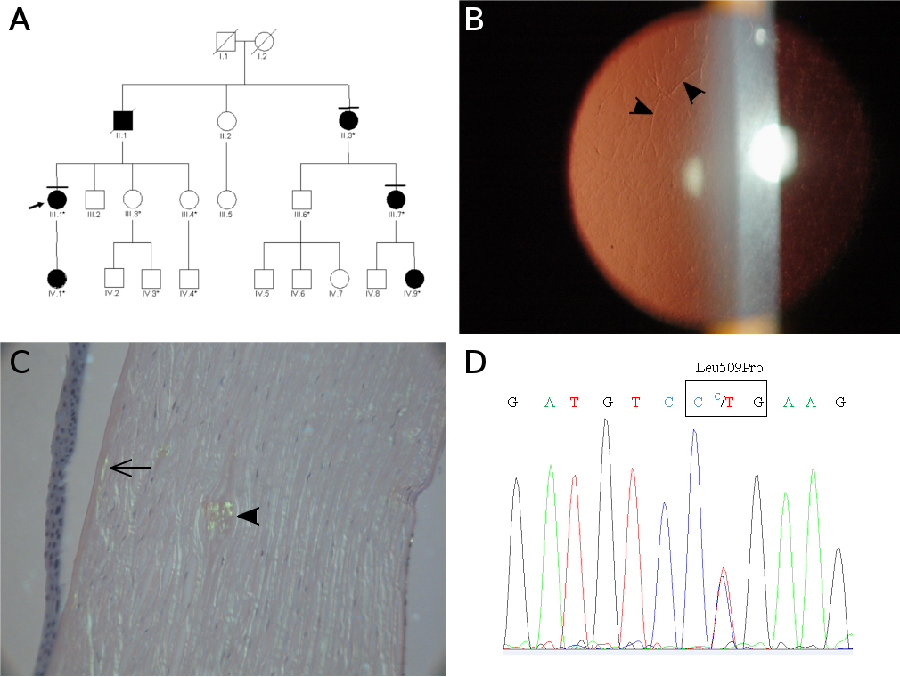 of corneal lamellae. D: The electropherogram of exon 11 of the TGFBI gene is shown. The proband III.1 has a heterozygous thymine to cytosine change at codon 509 in exon 11 (c.1526T>C, p.Leu509Pro).