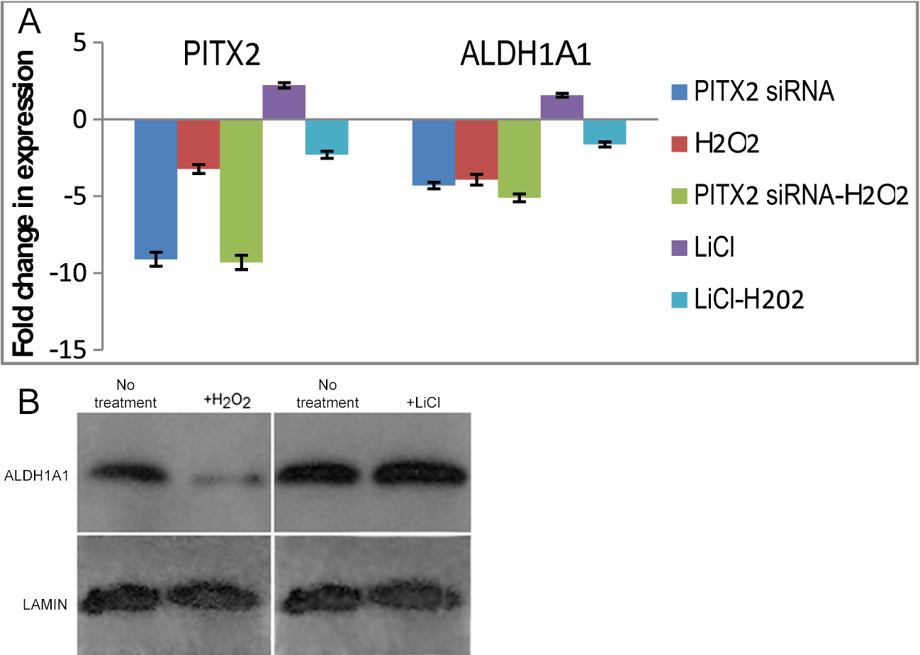 Figure 4. Effects of H2O2 and LiCl on ALDH1A1 expression in TM1 cells. A: As assessed by real time PCR. See text for details of treatments. Results shown are average of three independent experiments.