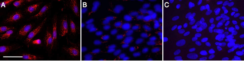 Figure 4. Cellular Localization of Snail in ARPE-19 cells. A: Cellular localization of Snail (red) at 2 days after passage. Snail is observed in both the nuclei and cytoplasm. Nuclei