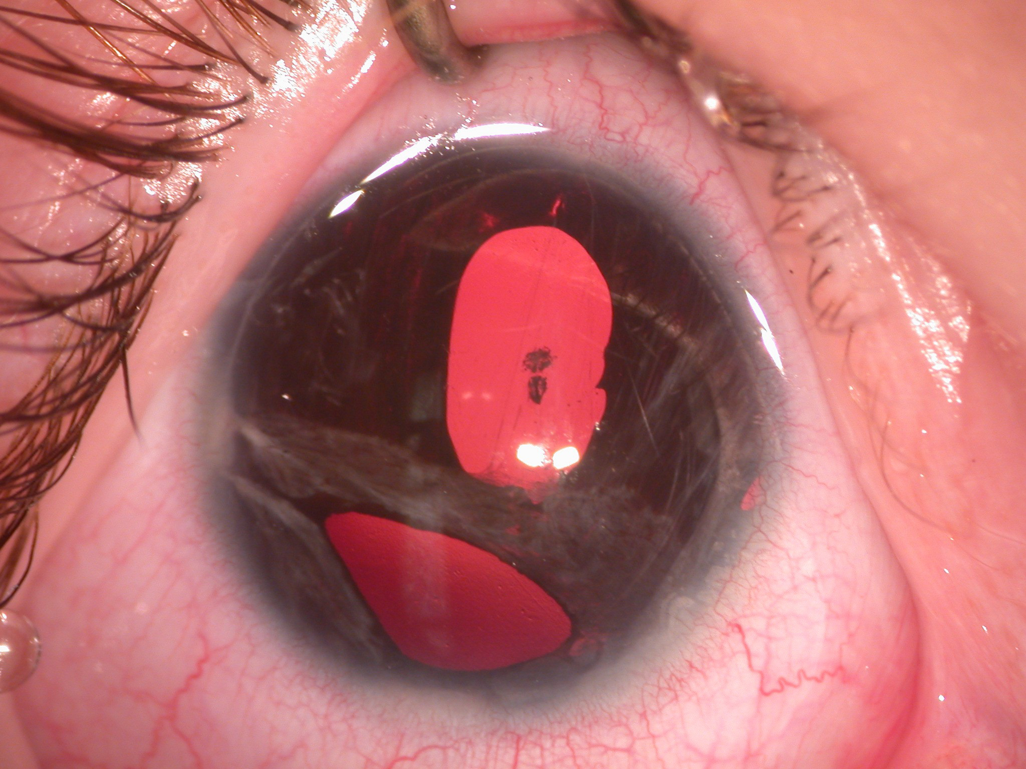Anterior segment photograph of the right eye shows polycoria, adhesion of iris strands with peripheral cornea, and posterior emblyotoxon.