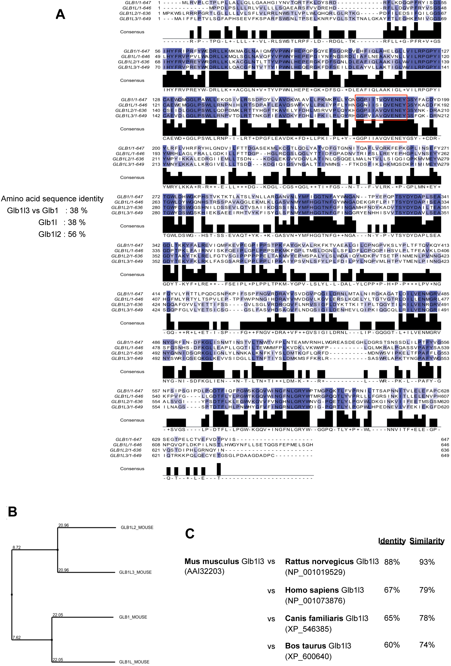 conservation between mouse β-galactosidase (Glb)-related members. B: