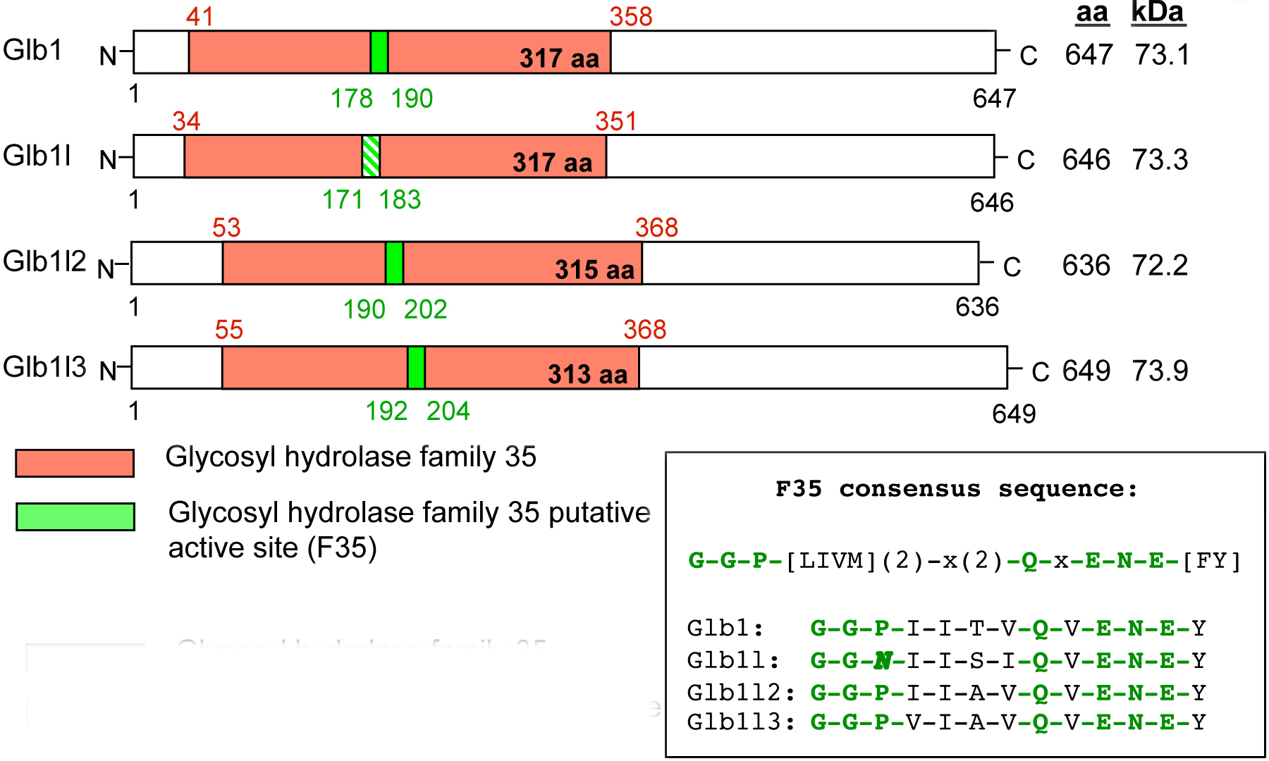 by the glycosyl hydrolase family 35 domain (red box) and its putative