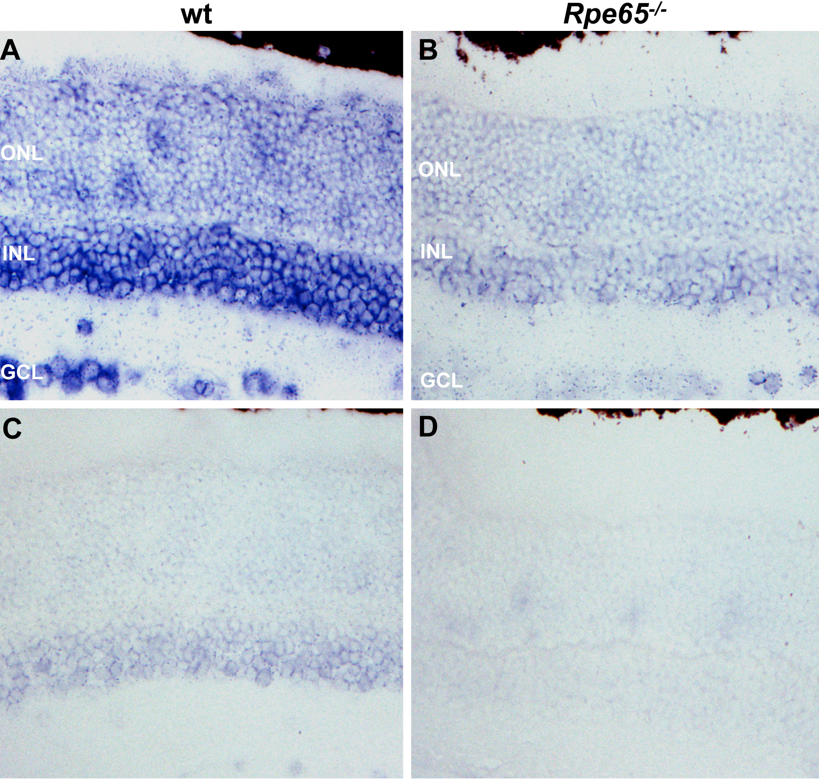 the antisense probe, respectively. C, D: Wild-type and Rpe65−/−