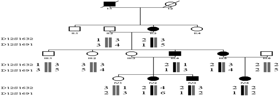 Figure 2. Pedigree and haplotype of the family. A four-generation pedigree with eleven available members is shown. Two markers (D12S1632
