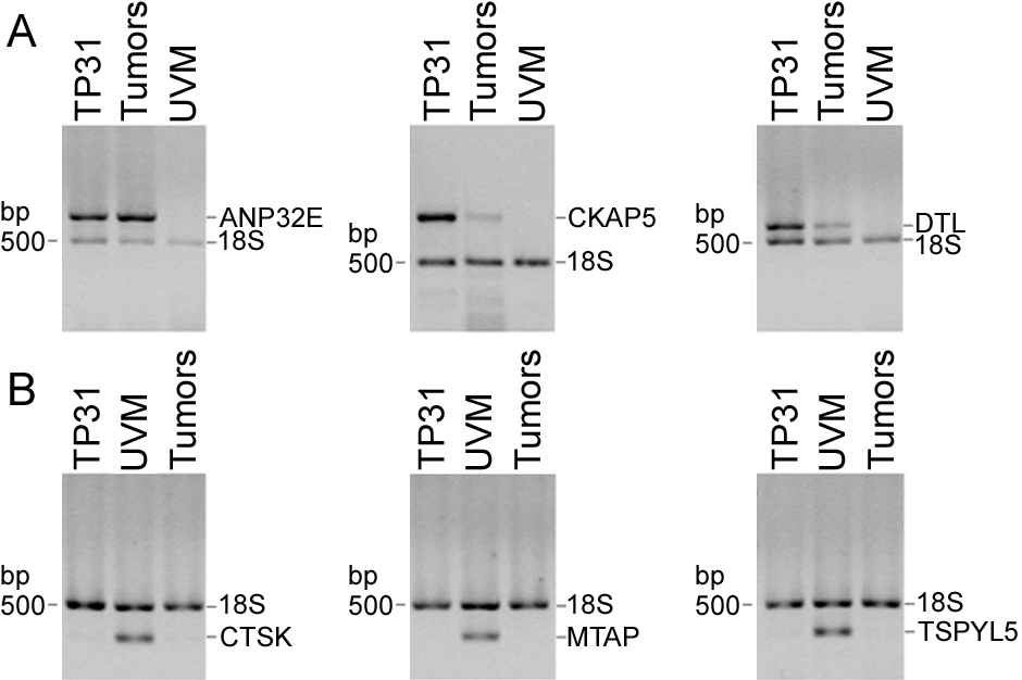 and UVM. A: Upregulated genes identified in the TP31 subtracted library (ANP32E, CKAP5, DTL). B: Downregulated genes identified in the UVM subtracted library (CTSK, MTAP, TSPYL5). The 18S rRNA was used as an internal control of amplification (489 bp). Data are representative of three independent experiments.