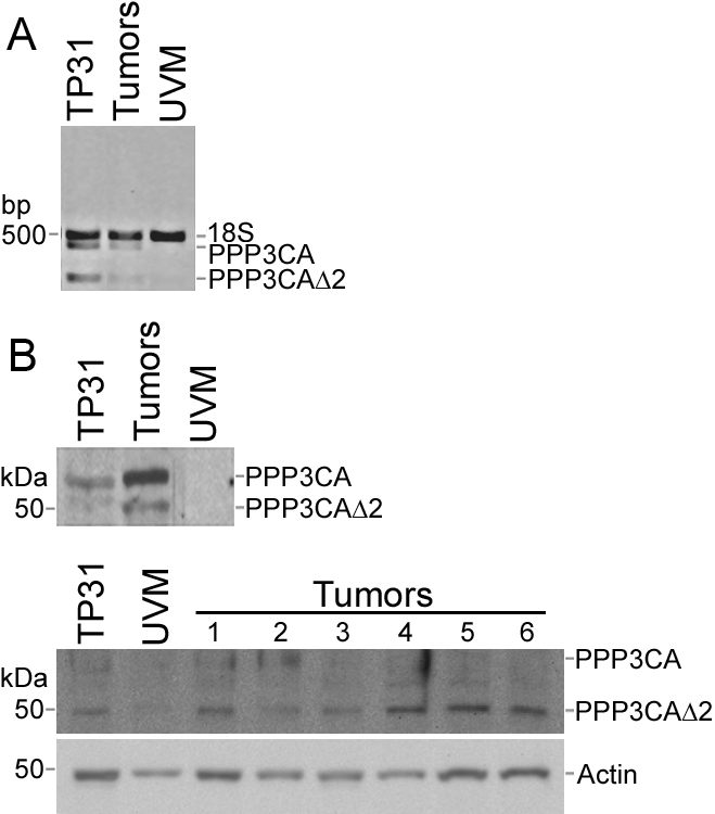 Figure 4. PPP3CA expression in UM. A: The expression level of PPP3CA mRNA was measured by semi-quantitative RT–PCR in the TP31 cell line, UM primary tumors (Tumors), and UVM. B: The expression level of the PPP3CA protein was measured by western blot in the TP31 cell line, UVM, and UM primary tumors