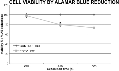 Reduction of AlamarBlue (%) resulting in % viability in EDEV-HCE compared to the CONTROL-HCE at 24 h, 48 h, and 72 h. The vertical lines represent the standard deviation (SD) between two different tissues. HCE: human corneal epithelium.