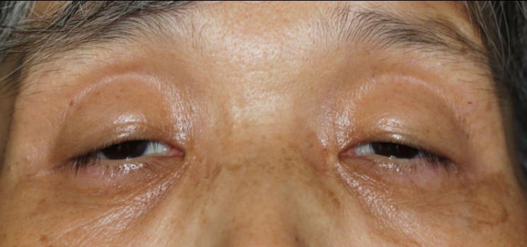 Photograph of II-5. She is 63 years old, has had gradual progressive ptosis since she was 50, and suffers a facial weakness.