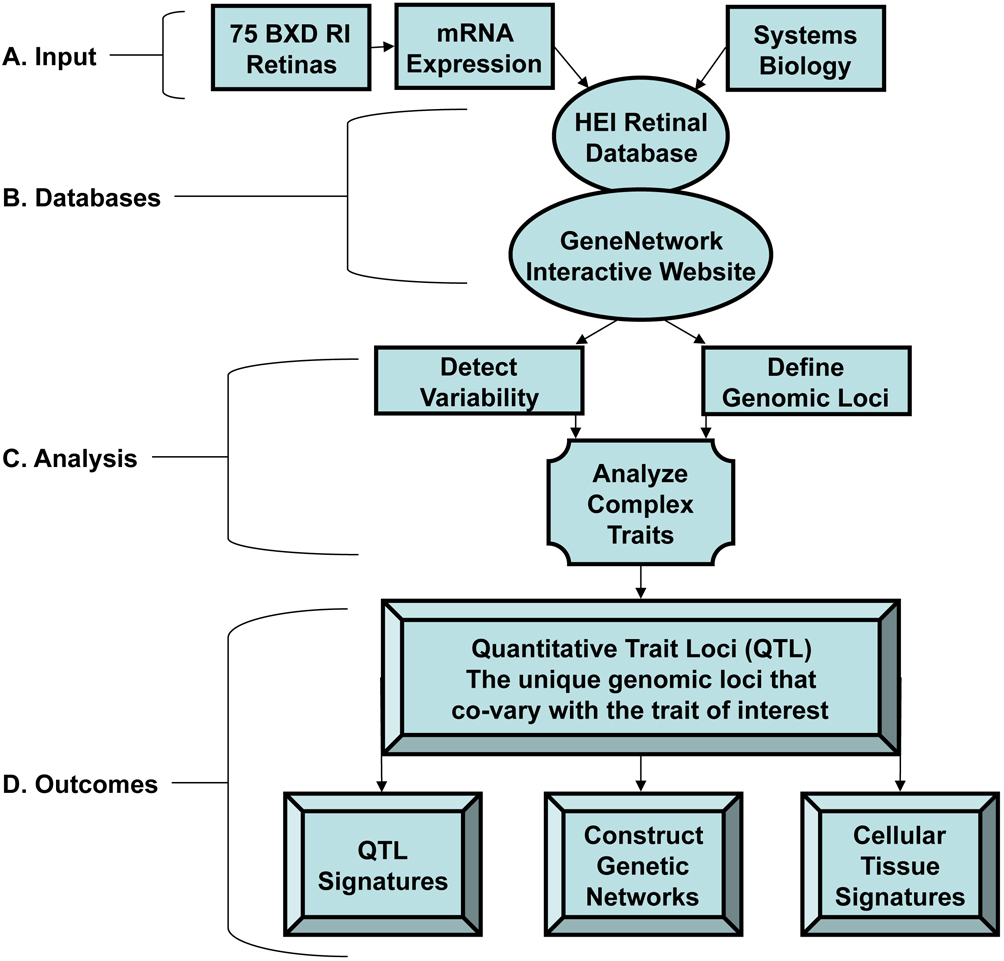 A: Input: A systems biology approach and the microarray data from 75 BXD RI mouse retinas feed into the HEI Retina Database.