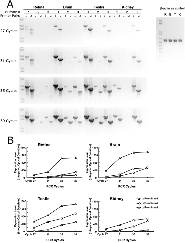 X. laevis tissues: the retina, brain, testis, and kidney. xlProminin-1, 2 and 3 are expressed in all four tissues. Among the three