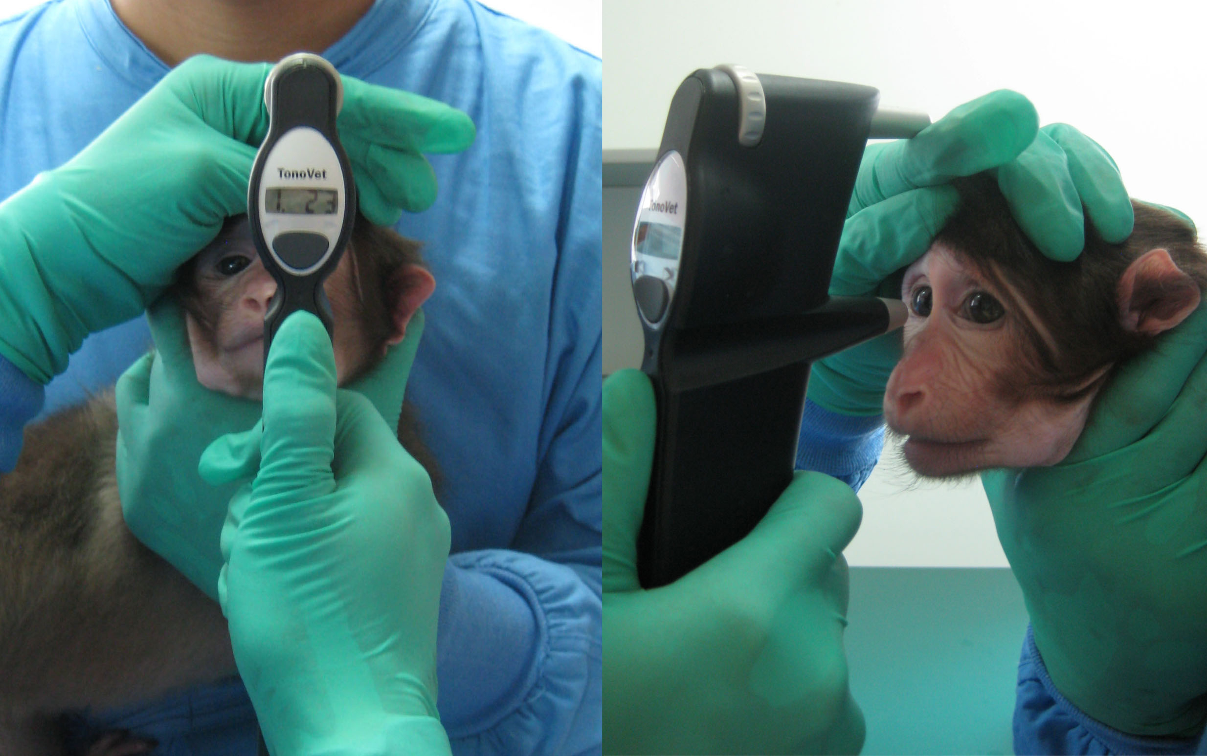 Measurement of IOP by the TonoVet® rebound tonometer in conscious Tibetan monkey. A trained monkey was gently held in an assistant's arms, allowing IOP measurement with the rebound tonometer.