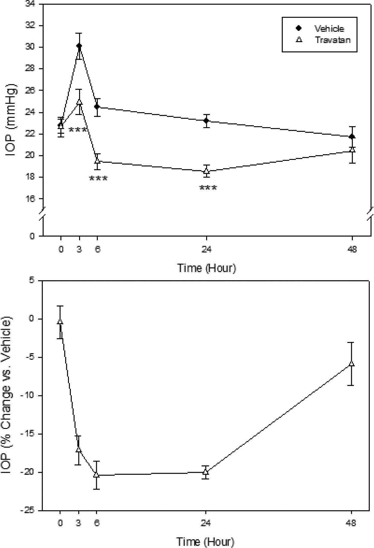 Top Panel: IOP values of both groups. ***p<0.001 between the two