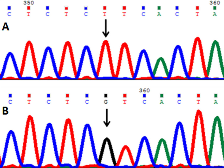: The sequence derived from patient shows a homozygous g.31812215T>G mutation.