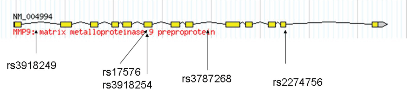 gene schematic representation, indicating tag SNP location. Exons are indicated by boxes and joined by introns indicated by solid lines. Figure adapted from the
