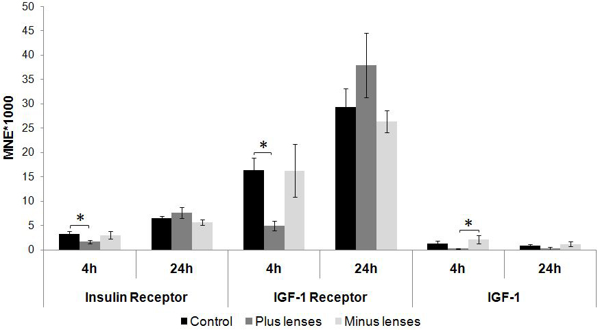 IGF-1 mRNA levels were significantly lower after 4 h of plus lens