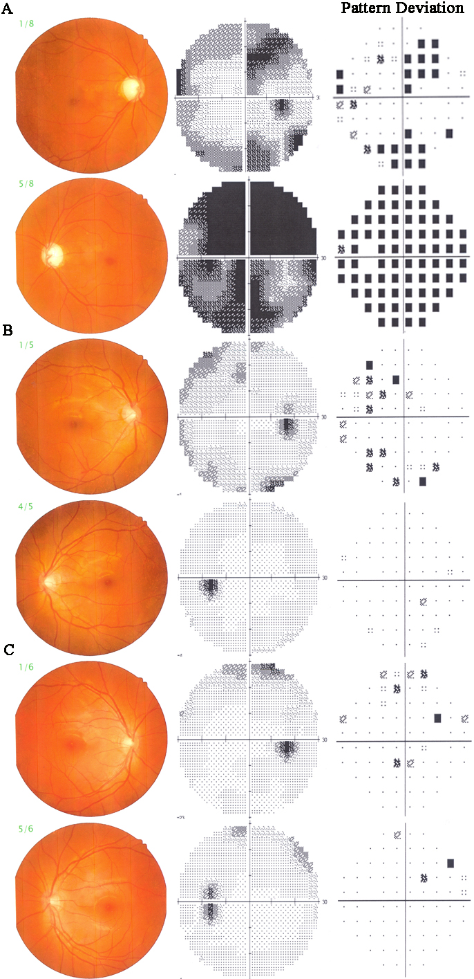 Optic disc photographs and Humphrey 30–2 visual fields in affected patients who carry the Pro370Leu mutation.