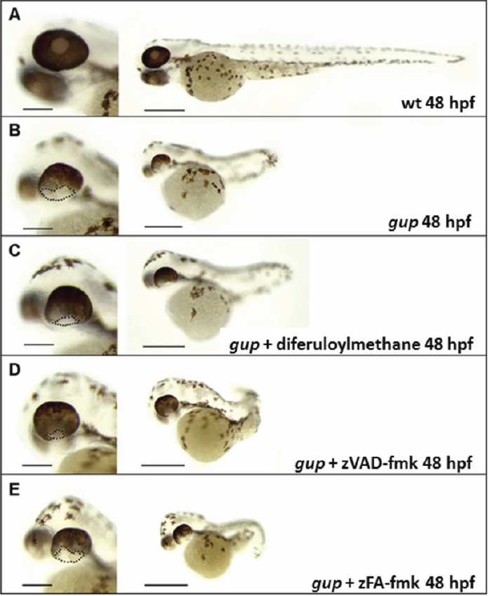 mutants. D: gup mutant treated with 300 µM zVAD-fmk, displaying a smaller open optic fissure than untreated mutants. E: gup mutant treated with 300 µM zFA-fmk, displaying a large open optic fissure as in untreated mutants. Optic fissure closure