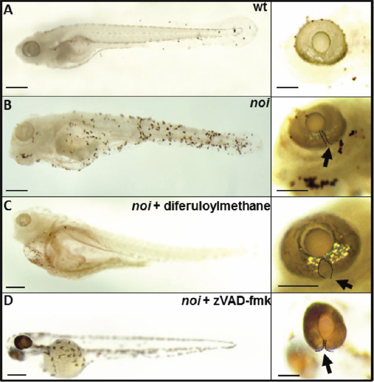 Figure 4. Representative images of the effect of diferuloylmethane on TUNEL-labeling in noi mutant larvae at 6 dpf. A: TUNEL-labeling in wholemount larvae (left) and wholemount eye (right) of wildtype zebrafish (wt). B: Extensive TUNEL labeling in larvae and eye of untreated noi mutant zebrafish. C: noi mutant larvae treated with 5 µM diferuloylmethane. D: noi larvae treated with 300 µM zVAD-fmk. Arrow points to optic fissure closure defect delineated by black dotted line. Scale