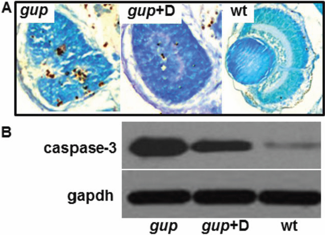 with methyl green. B: Representative western blot of lysates from untreated mutant larvae (gup), mutant larvae treated with 5 µM diferuloylmethane (gup+D) and wildtype larvae (wt). Upper lanes, correspond to cleaved caspase-3; lower lanes, corresponding gapdh loading controls.