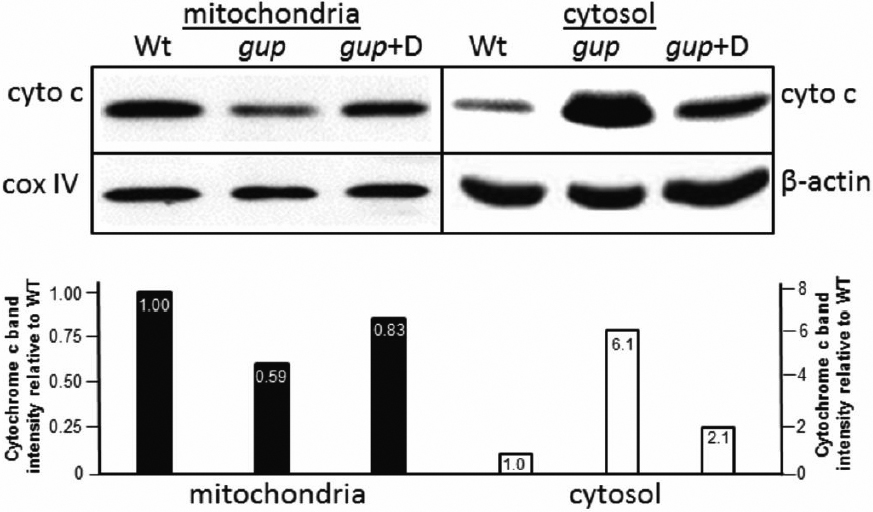 Figure 6. Representative western blots showing cytochrome c levels in gup mutants treated with diferuloylmethane. Cytochrome c (cyto c) levels were determined in embryos treated for 6 days. Mitochondrial