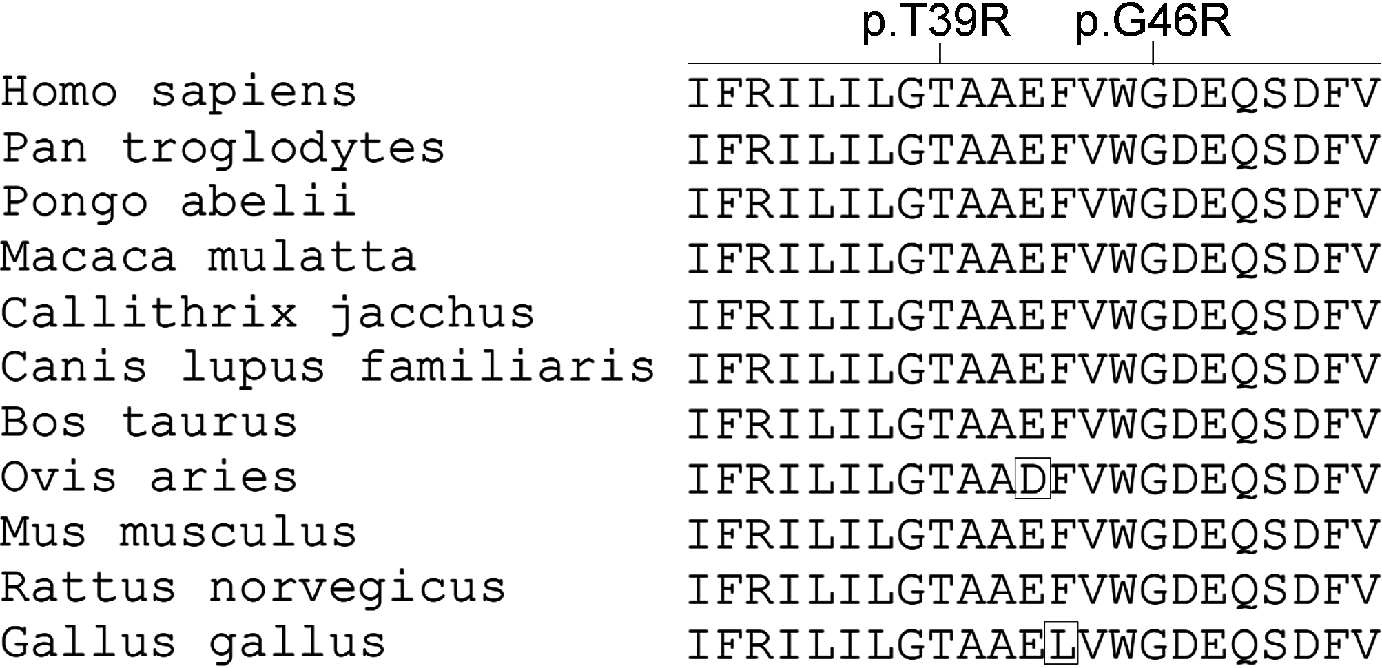 Protein sequence alignment of eleven GJA8 orthologs. The regions with the novel p.T39R and p.G46R mutations are highly conserved in the eleven species.
