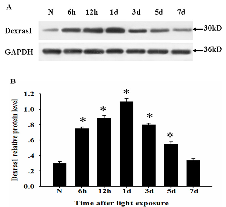 Figure 2. Dexras1 protein level upregulated in the retina after light exposure. A: Total protein was extracted from normal and injured retinas at various times after light exposure, then assessed by western
