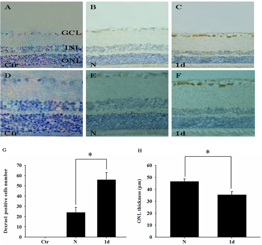 observed in sections of A: negative control retina (primary antibody was substituted by PBS), B: normal retina, and C: injured retina at 1 day after light exposure by immunohistochemistry. D-F: Magnified images for A-C, respectively, are represented. G: Quantitative results for numbers of Dexras1 positive cells are at a lower magnification. H: Quantitative analysis of ONL thickness between the normal retina and injured retina was conducted. Values are expressed as