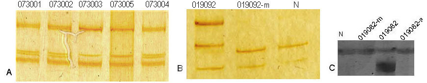 Figure 5. A single-strand, conformation, polymorphism analysis and a 16% denaturing polyacrylamide gel electrophorese analysis. A: Single strand conformation polymorphism (SSCP) analysis for the heterozygous mutation c. 1876C>T revealed that the mutant