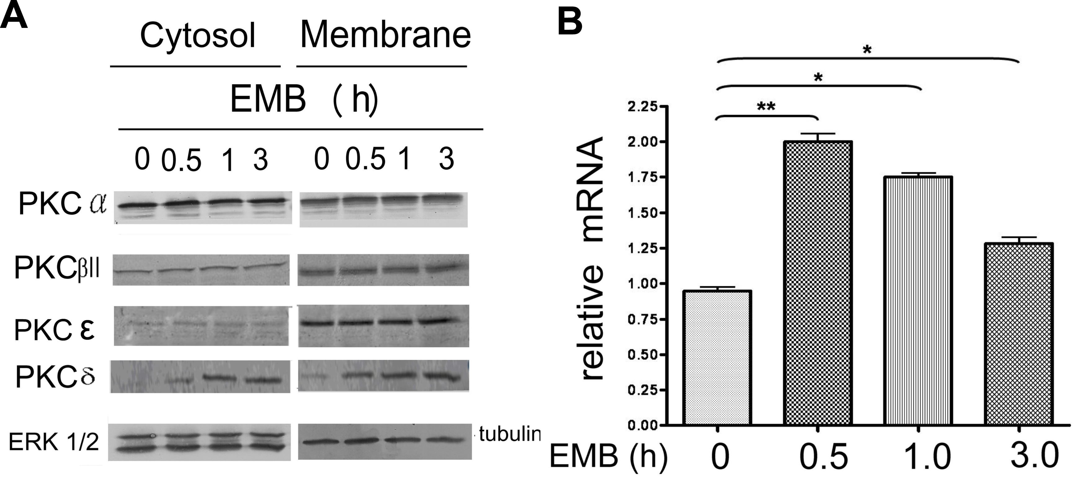 blots of cytosolic and membrane PKCα, βII, and δ (A), and real