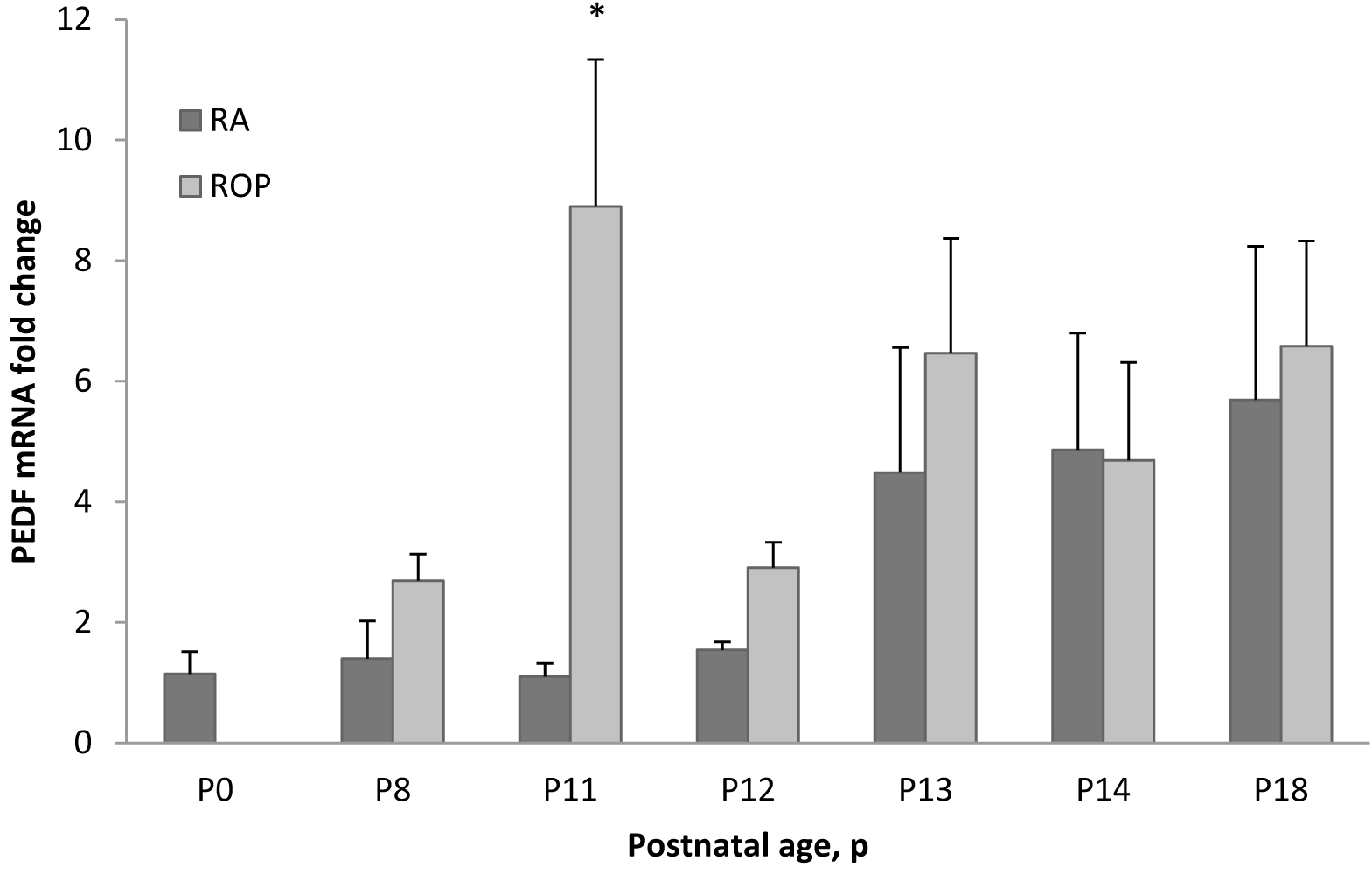 *Post-hoc testing revealed increased PEDF mRNA at P11 in the