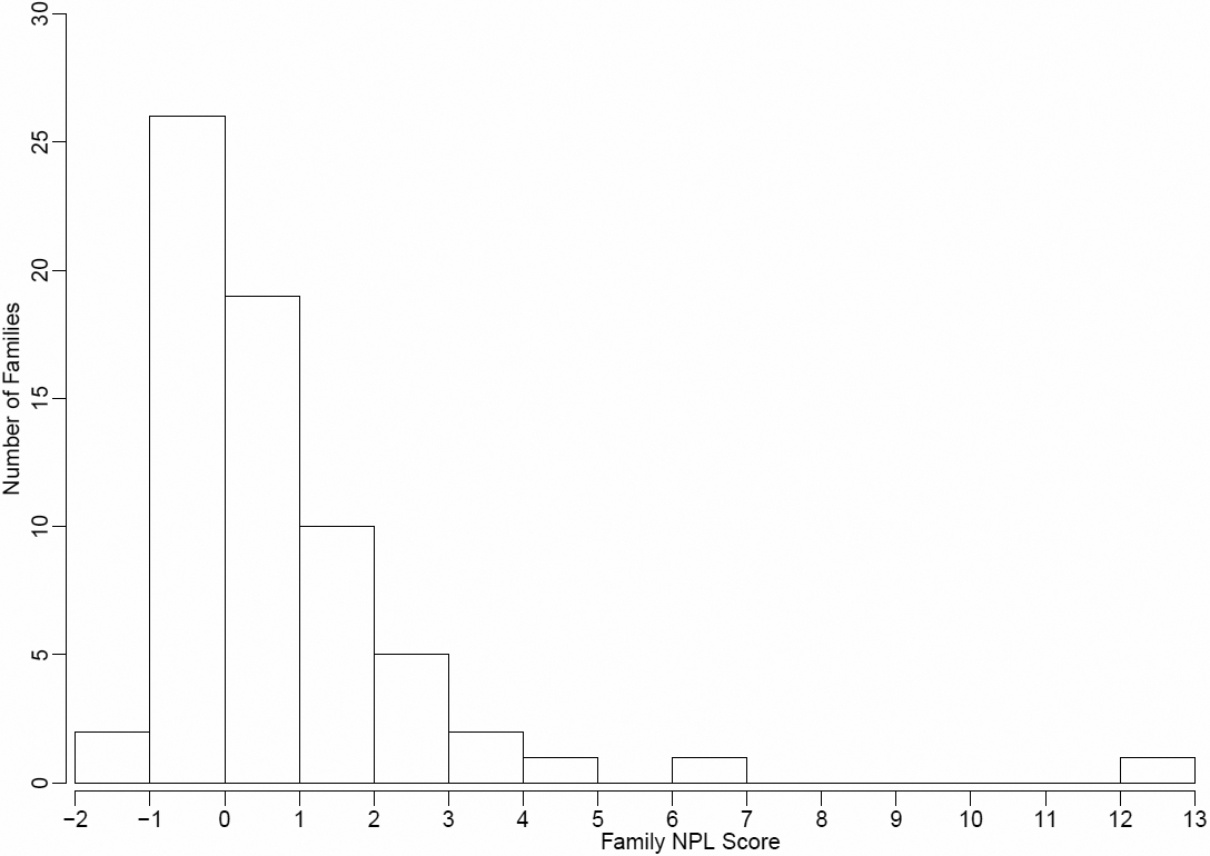 Distribution of individual family NPL scores in the Ashkenazi Jewish families.