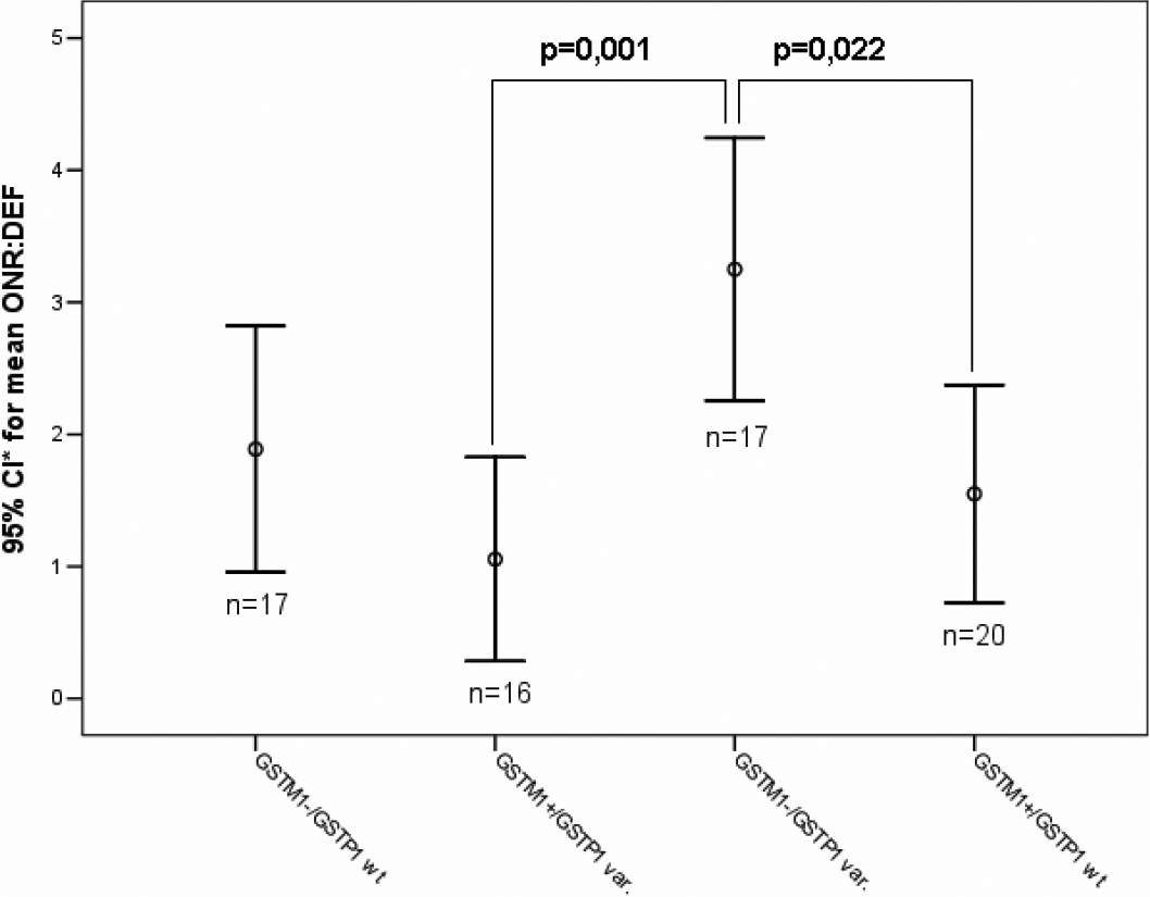 higher mean value of ONR:DEF than individuals carrying at least one functional copy of GSTM1. *CI: Confidence Interval.