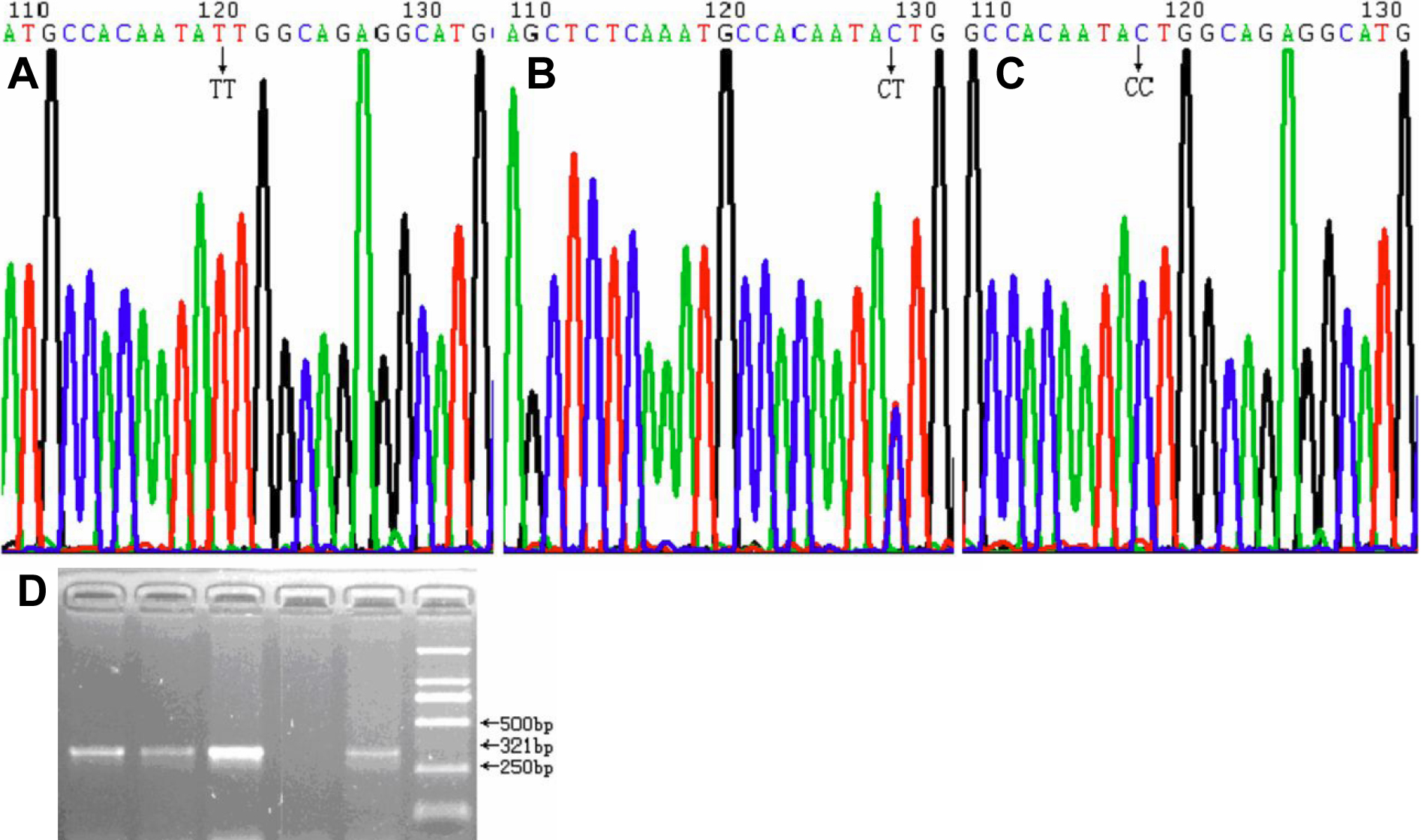 Representative chromatograms displaying and the PCR electrophoresis image for the SNP