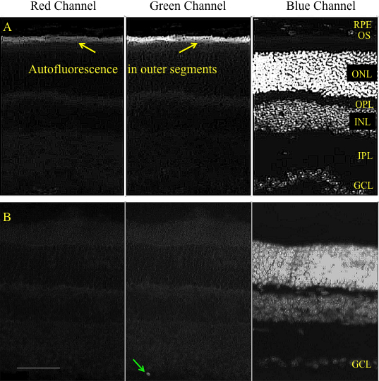 A: Some sections of retina with no treatment (control) showed patchy autofluorescence in the photoreceptor outer segment layer.