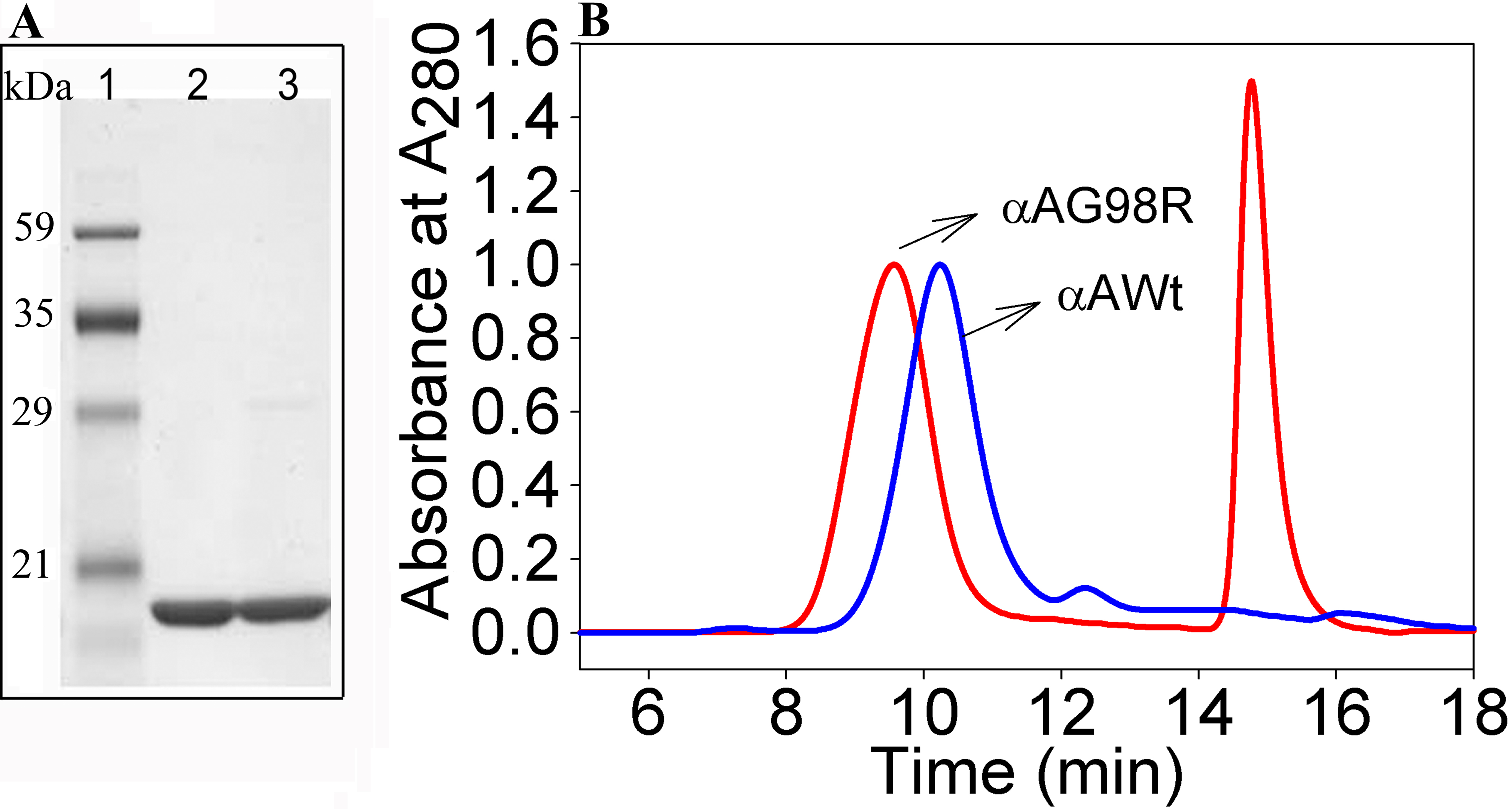 Lane 3 αAG98R-crystallin. B: Size exclusion chromatography