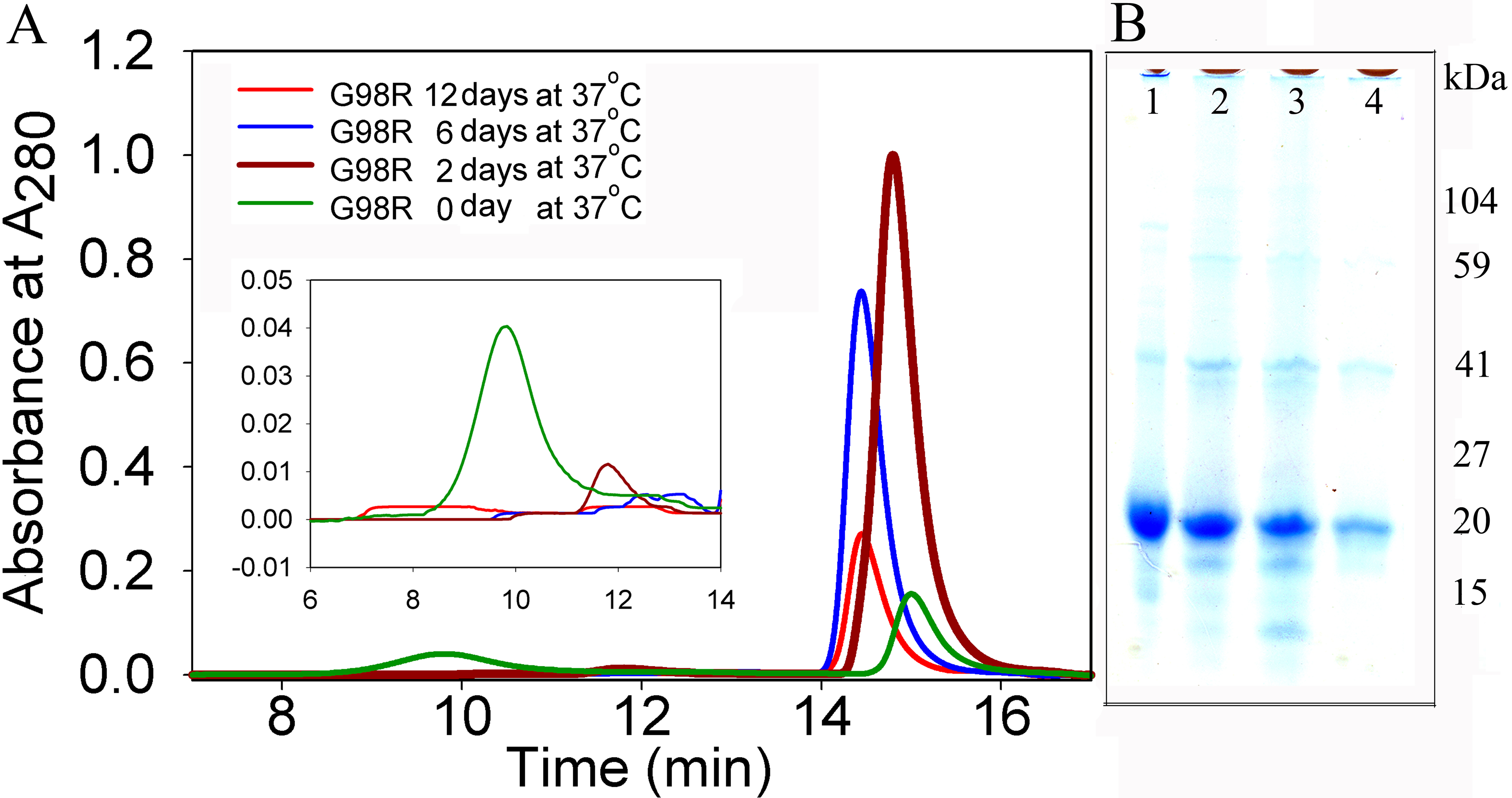 oligomer region, indicating loss of oligomer peak. B: SDS–PAGE