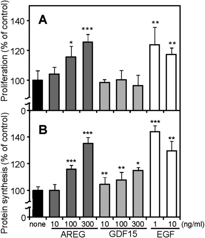 SRA01/04 cells were incubated with recombinant AREG, GDF15, or EGF at the indicated concentrations and examined 3H-thymidine (A) or 3H-leucine (B) uptake as described in Methods. Values are expressed as the mean±SD (n=4~5) and presented as % of control (none). Essentially