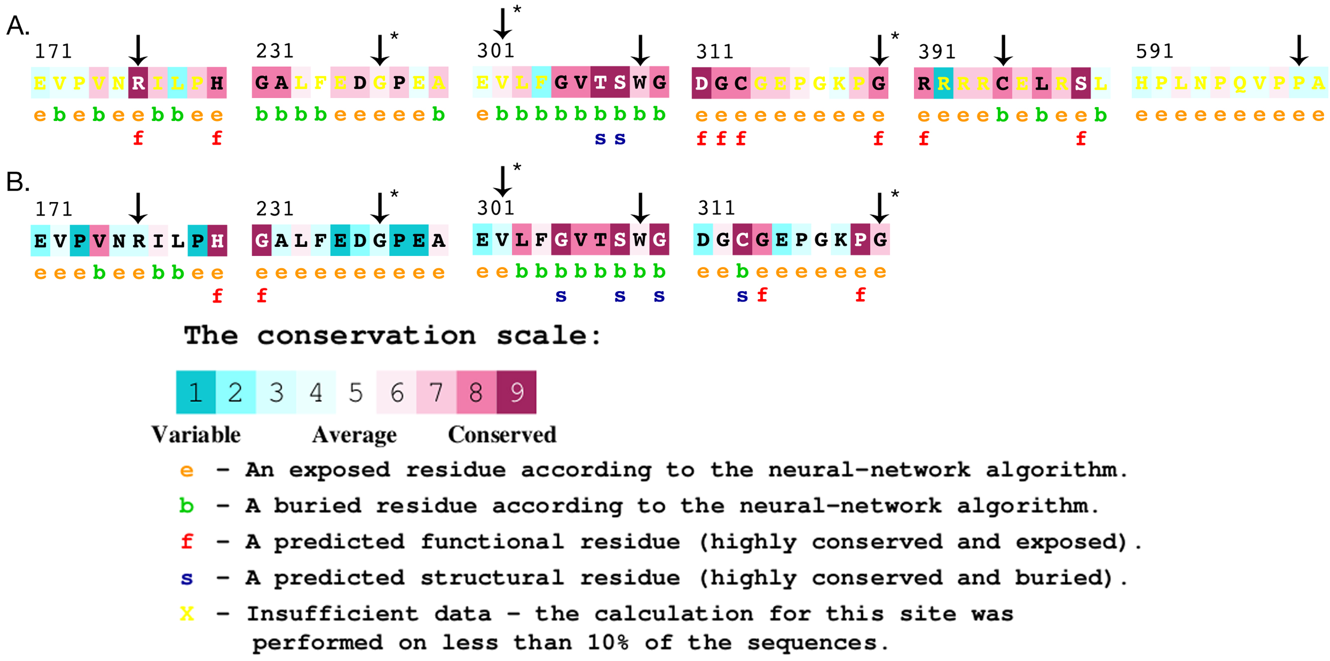 asterisks, positions 237, 302, 320, and 395) and in published reports